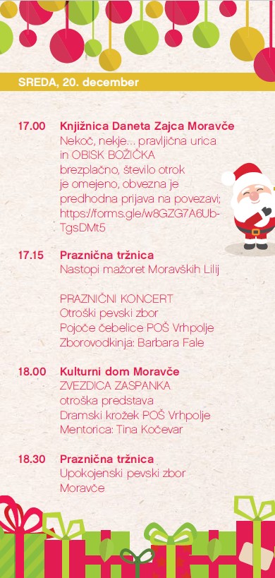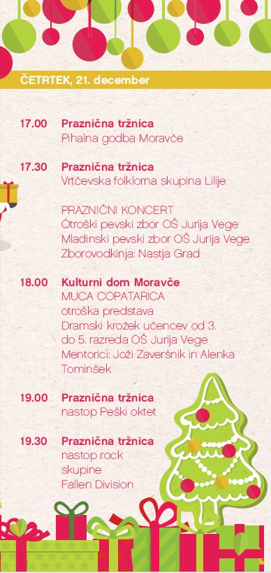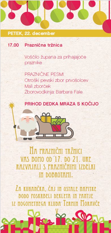 Z veseljem vam sporočamo, da vas Turistično društvo Moravče v sodelovanju z Občino Moravče vabi na praznično tržnico, ki bo potekala od 20. do 22. decembra 2023. Vsak dan se bo praznično vzdušje odvijalo med 17. in 21. uro.